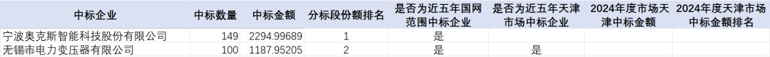 分析市场能力变化,2024年度中标企业中1家企业本次项目中标金额排名高于或与2024年度接近;1家近五年未在国网范围中过标的企业实现中标。详情如下:
