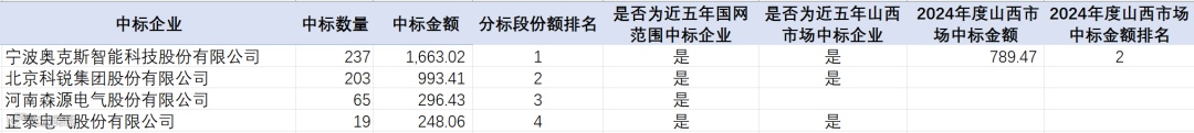本项目4家中标企业全部为近五年国网范围相同物资中标企业,同时3家为近五年山西市场相同物资中标企业,其中3家企业不是2024年度山西市场相同物资中标企业。