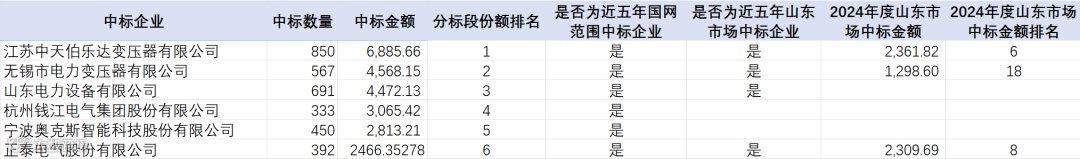 本项目6家中标企业全部为近五年国网范围相同物资中标企业,同时4家为近五年山东市场相同物资中标企业,其中3家企业不是2024年山东市场相同物资中标企业。