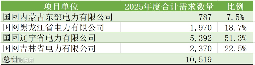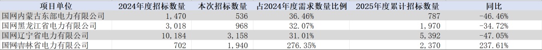 对比不同项目单位在2025年度两个批次的需求情况,蒙东、吉林、辽宁环比增幅很大;黑龙江环比稳中微降。