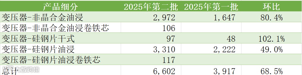 对比产品细分品种在2025年度两个批次的需求情况,本批次需求量大幅增长,同时非晶合金油浸、硅钢片干式、硅钢片油浸卷铁芯产品都有大幅增长。