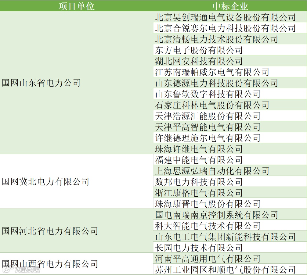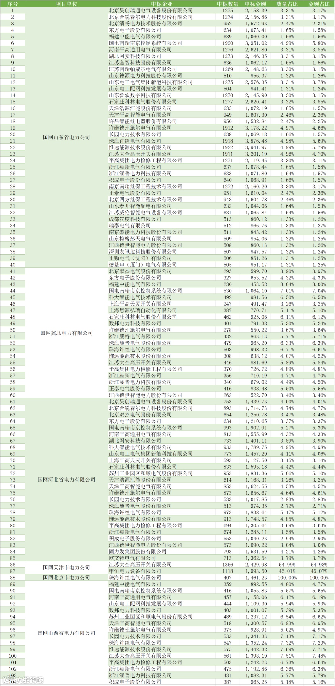 具体到各项目单位的中标情况,山东项目共有40企业中标、冀北项目共有20家企业中标、河北项目共有25家企业中标、天津项目共有2家企业中标、北京项目共有1家企业中标、山西项目共有16家企业中标。以下是各项目单位详细中标情况。