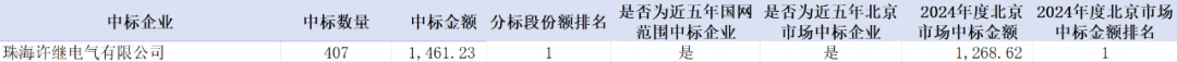 分析市场能力变化,2024年度中标企业中1家企业本次项目中标金额排名高于或与2024年度接近;0家近五年未在国网范围中过标的企业实现中标。详情如下: