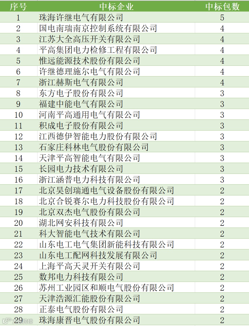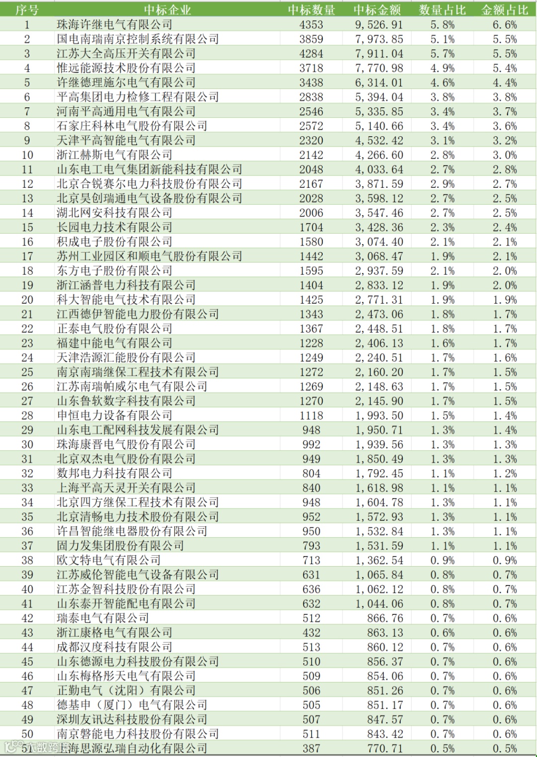 根据中标公示信息,华北区域一二次融合成套柱上断路器第二次区域联合招标项目共有51家企业中标。珠海许继电气有限公司中标金额最多。