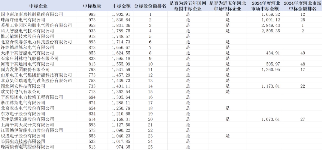 分析市场能力变化,2024年度中标企业中9 家企业本次项目中标金额排名高于或与2024年度接近;0家近五年未在国网范围中过标的企业实现中标。详情如下: