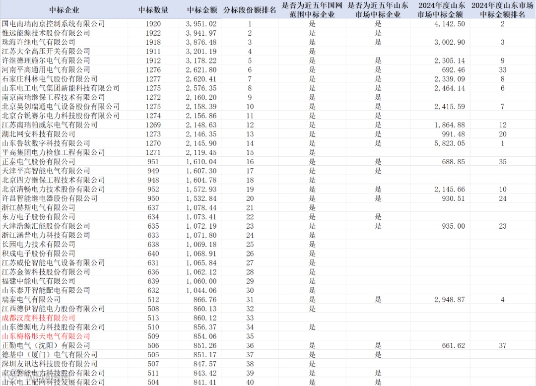 分析市场能力变化,2024年度中标企业中12家企业本次项目中标金额排名高于或与2024年度接近;2家近五年未在国网范围中过标的企业实现中标。详情如下: