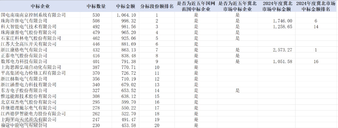 分析市场能力变化,2024年度中标企业中3家企业本次项目中标金额排名高于或与2024年度接近;0家近五年未在国网范围中过标的企业实现中标。详情如下: