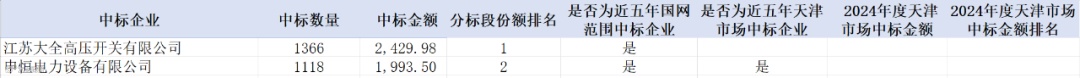 本项目2家中标企业,全部为近五年国网范围相同物资中标企业,同时1家近五年天津市场相同物资中标企业,其中2家企业不是2024年度天津市场相同物资中标企业。