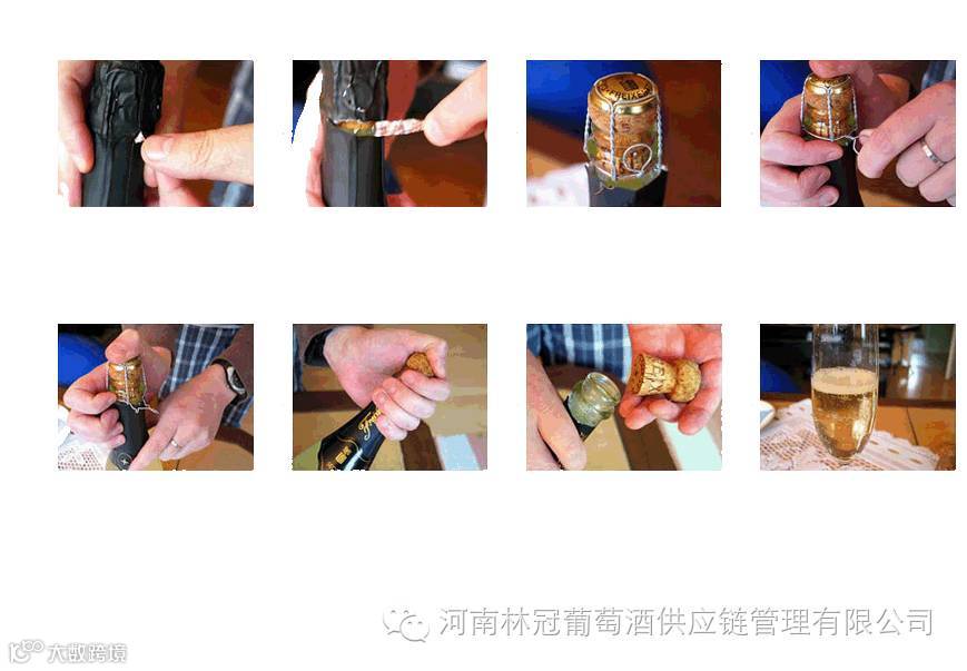 起泡酒瓶内压强很高,所以,开瓶时,瓶口不能对人,并且要按着木塞打开铁丝,再一手握着酒瓶,一手拿块儿布轻轻地转动木塞,听到轻巧的砰的一声,如未饮完,用专门的香槟塞密封。