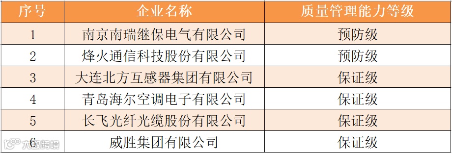 质量管理能力高等级认定,本次43家中2家为预防级、41家为保证级。