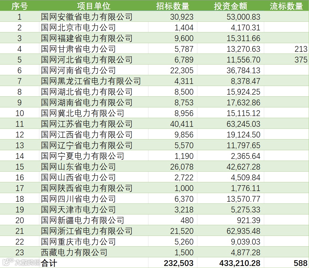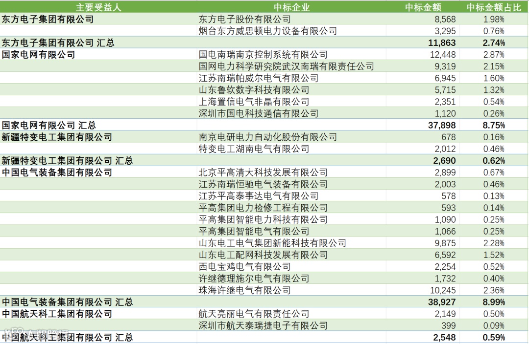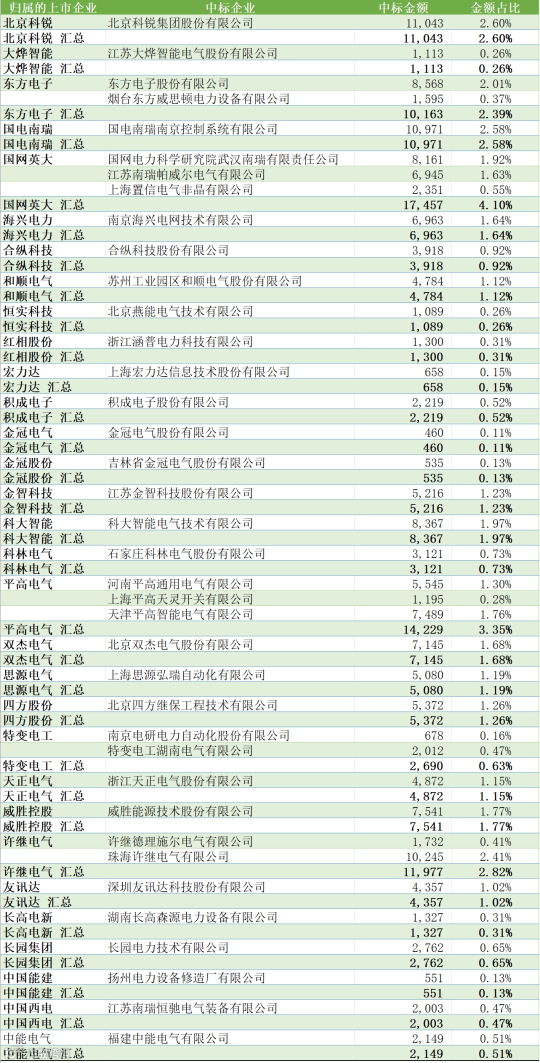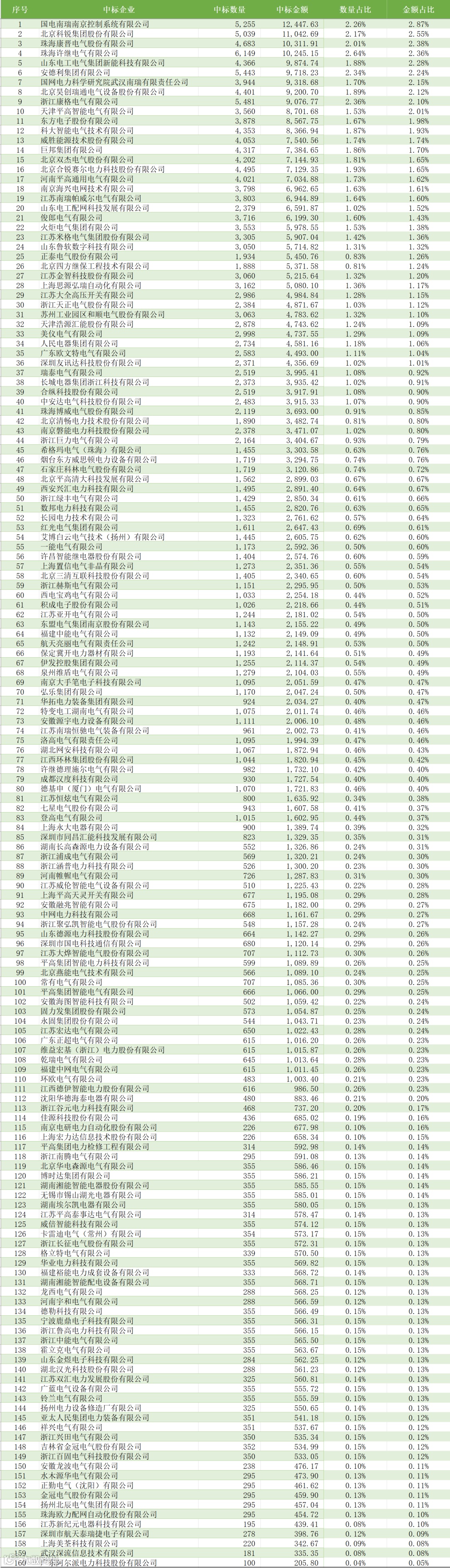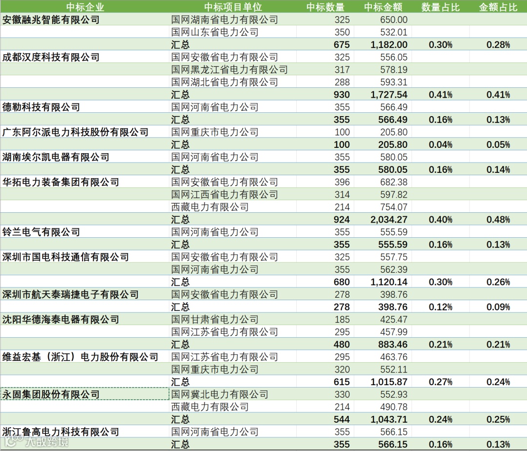 安徽融兆智能有限公司、深圳市国电科技通信有限公司、沈阳华德海泰电器有限公司、维益宏基(浙江)电力股份有限公司、永固集团股份有限公司分别在2个区域项目中标,且中标2个项目单位,2个标包。