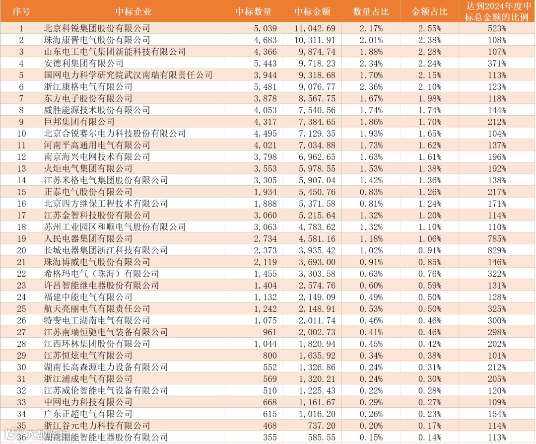 共有36家企业中标金额已经超过2024年度全年同类物资中标金额。