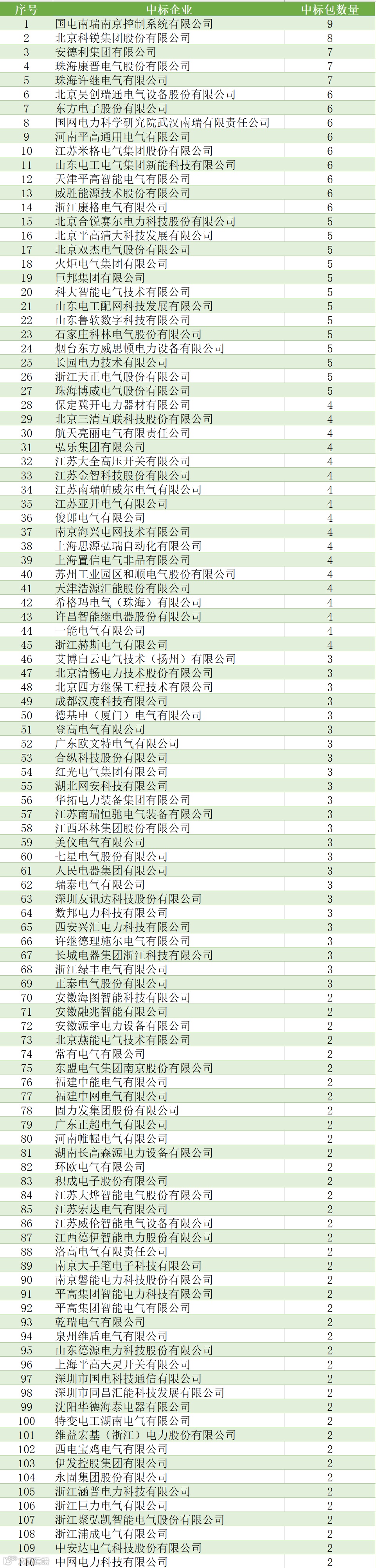 分析中标的包数分布情况,共有110家企业中的标包数量达到或超过2个;本批次最多的是国电南瑞南京控制系统有限公司,共有9个包中标。