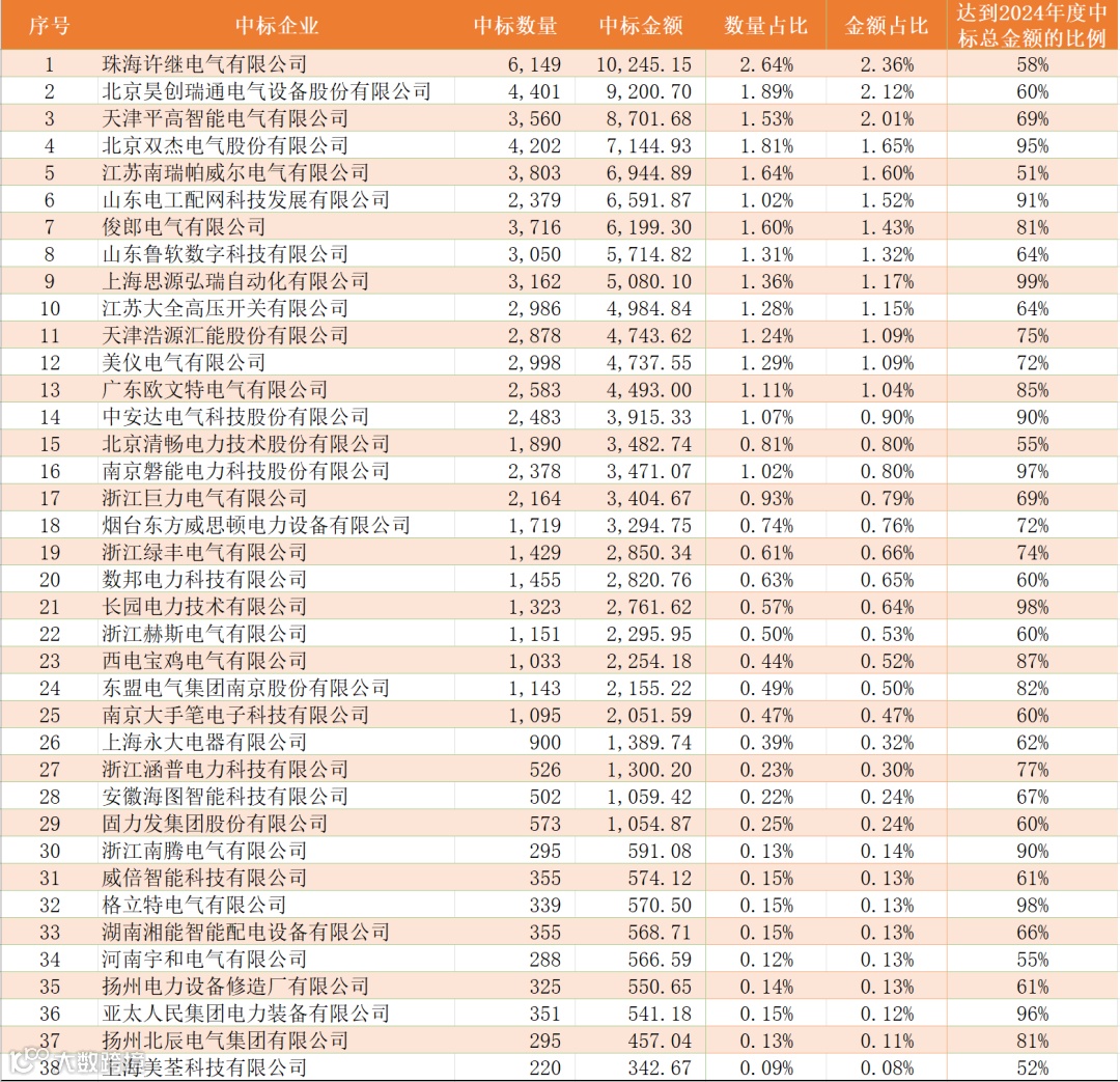 共有38家企业中标金额已经达到2024年度全年同类物资中标金额的50%~100%。