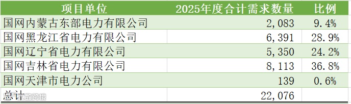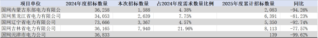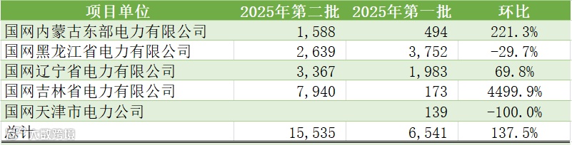 对比不同项目单位在2025年度两个批次的需求情况,蒙东、辽宁、吉林环比增幅很大;黑龙江环比降幅较大。天津本批次未纳入东北区域招标。