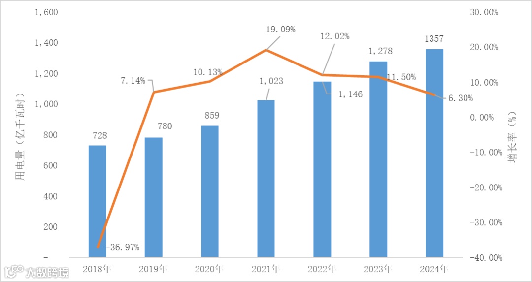 根据调整后的三次产业划分规定,自2018年以来至2024年底,中国第一产业用电总量增长了86.4%,从2018年的728亿千瓦时增长到2024年的1,357亿千瓦时,年均增长率约11.03%。