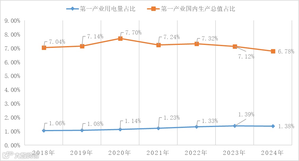 2018年以来,第一产业用电量占比总体处于缓慢提高的趋势,而第一产业国内生产总值占比有升有降,但总体处于下降通道。