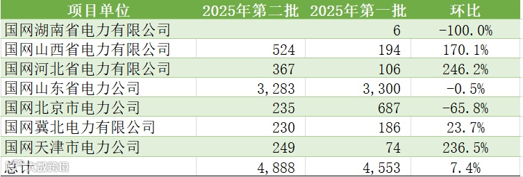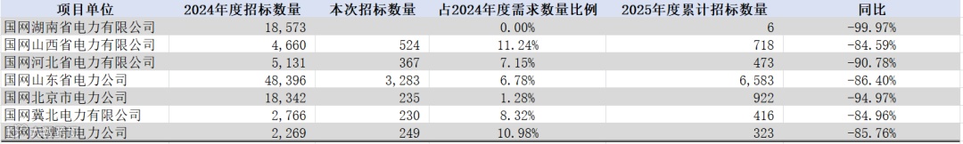 对比不同项目单位在2025年度两个批次的需求情况,湖南本次未纳入华北区域招标;山西、河北、天津环比增幅很大;北京环比降幅较大;山东环比稳中微降。