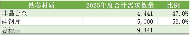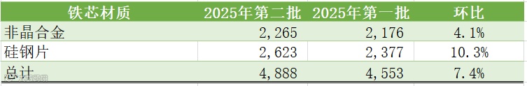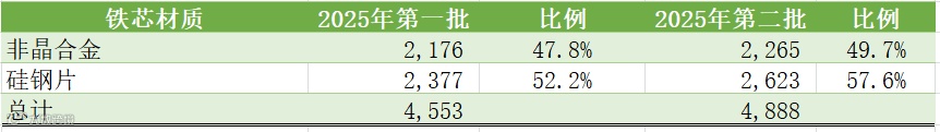 同时对比在2025年度两个批次的需求数量占比情况,非晶合金产品在2025年第二批次中占比相对于2025年第一批次有所提高。但硅钢片产品在两个批次中都占半数以上。