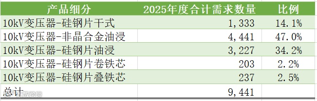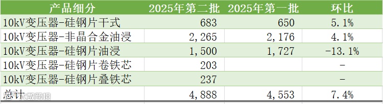 对比产品细分品种在2025年度两个批次的需求情况,本批次需求量略有增长,同时硅钢片干式、非晶合金油浸产品都有小幅增长,硅钢片油浸产品有明显下降。