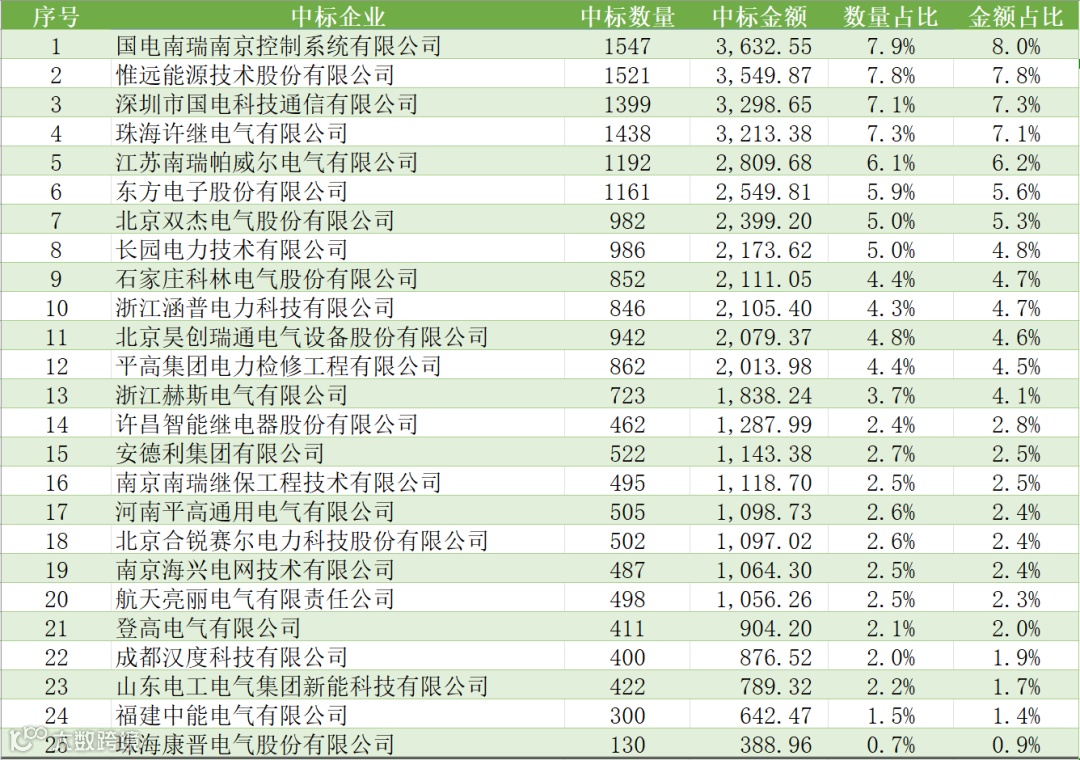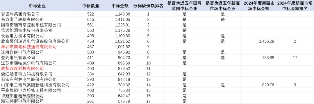 分析市场能力变化,2024年度中标企业中1家企业本次项目中标金额排名高于或与2024年度接近;1家近五年未在国网范围中过标的企业实现中标。详情如下: