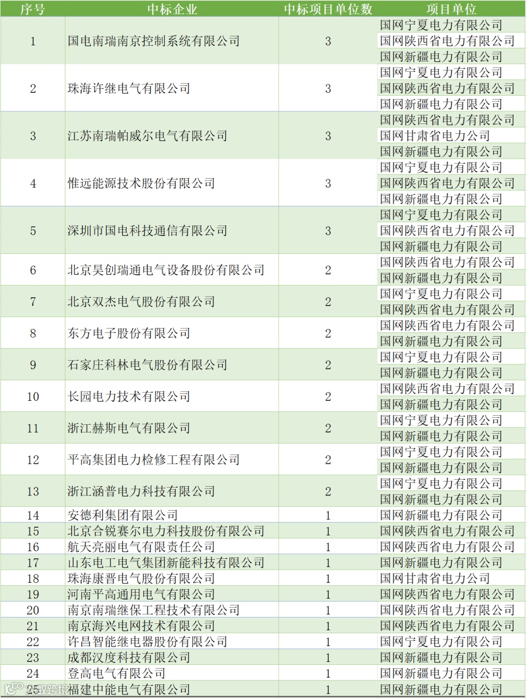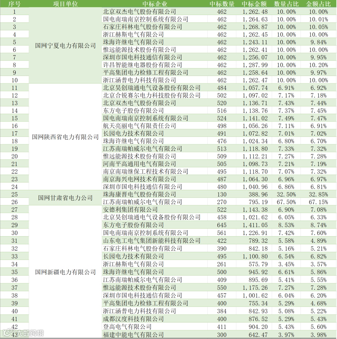 具体到各项目单位的中标情况,宁夏项目共有10企业中标、陕西项目共有14家企业中标、甘肃项目共有2家企业中标、新疆项目共有17家企业中标。以下是各项目单位详细中标情况。