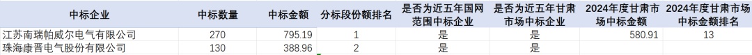 分析市场能力变化,2024年度中标企业中2家企业本次项目中标金额排名高于或与2024年度接近;2家近五年未在国网范围中过标的企业实现中标。详情如下: