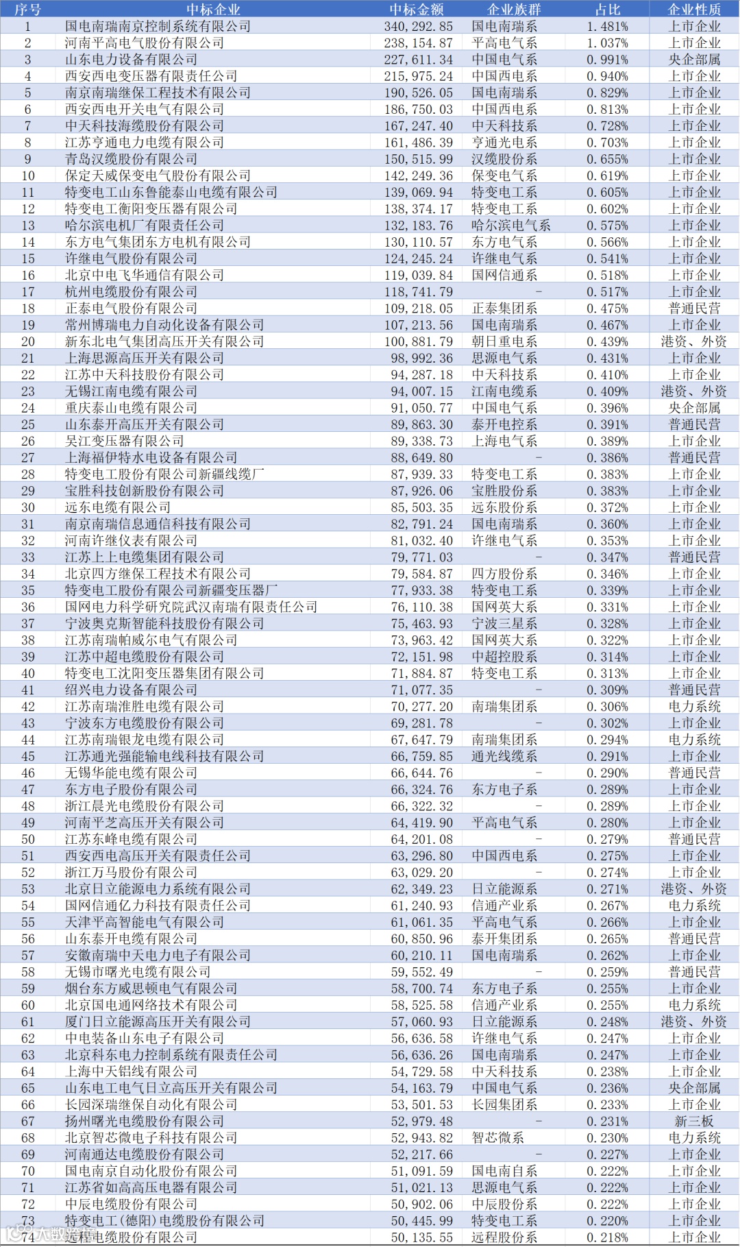 思源电气系有10家企业中标,合计中标金额约25.85亿元,占比约1.1%