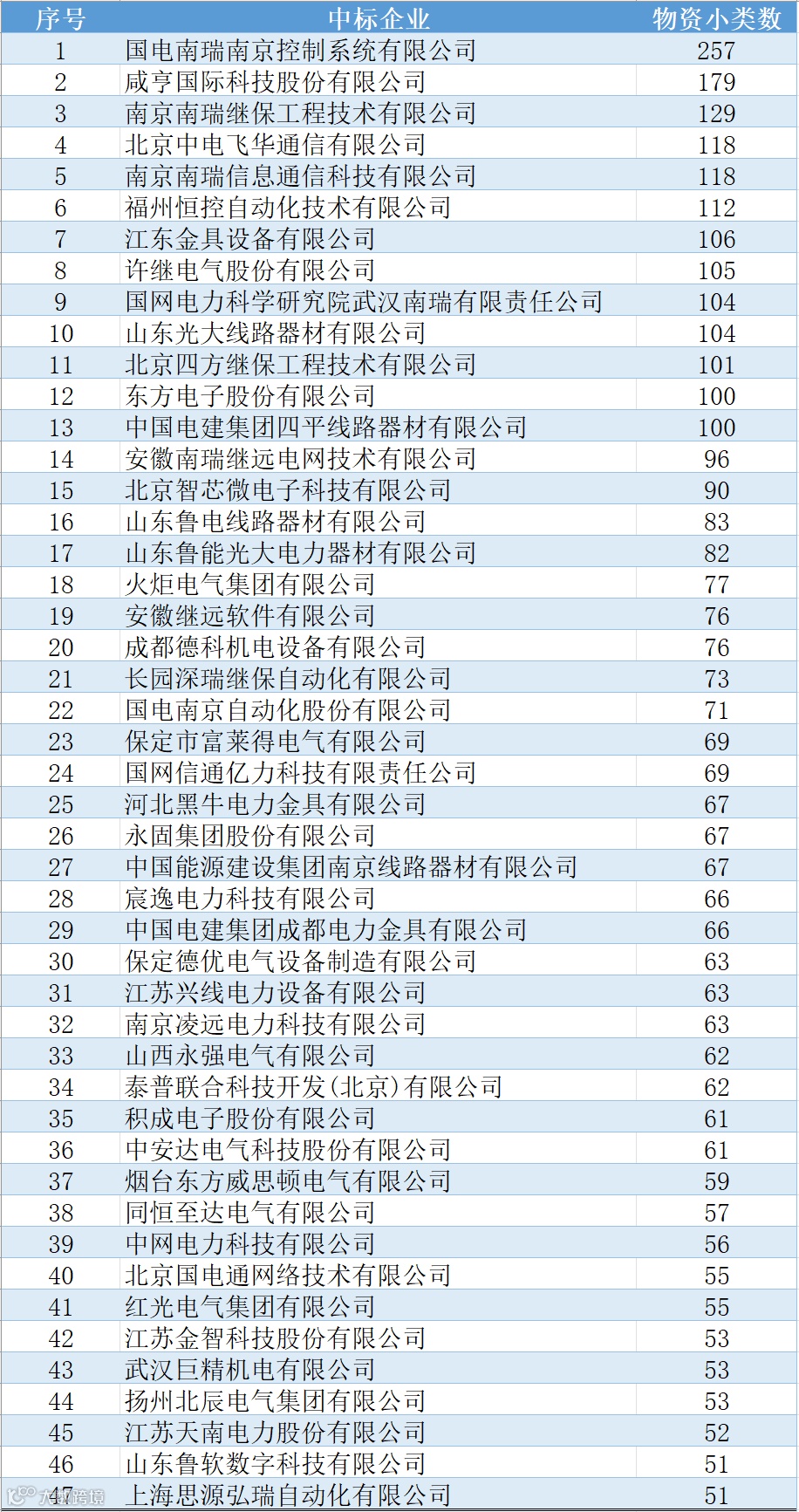 根据物资小类进行统计,共有47家企业中标的物资小类种数超过50种,中标2种以上的企业共有2636家。
