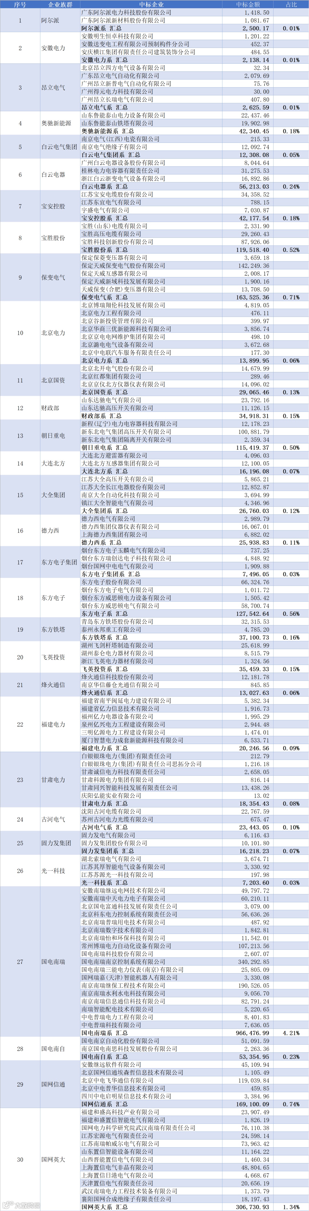 泰开集团系有10家企业中标,合计中标金额约21.22亿元,占比约0.9%