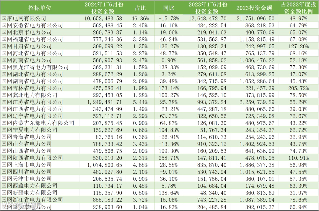 综合国网2024年1~6月份物资招标项目数据,合计投资金额约2,297.59亿元。