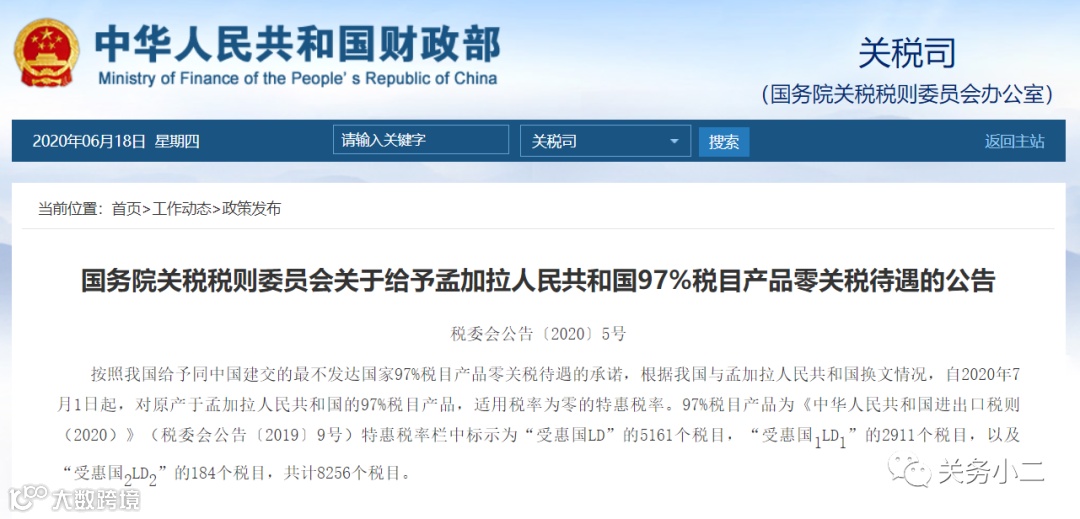 6月18日,国务院关税税则委员会发布公告,决定自2020年7月1日起,对原产于孟加拉人民共和国的97%税目产品,适用税率为零的特惠税率。