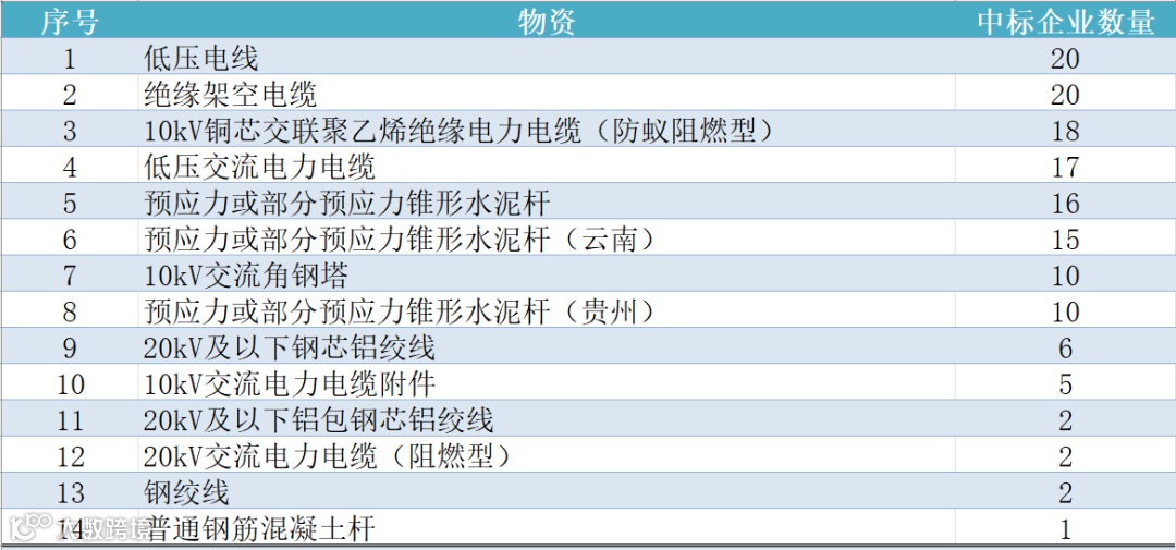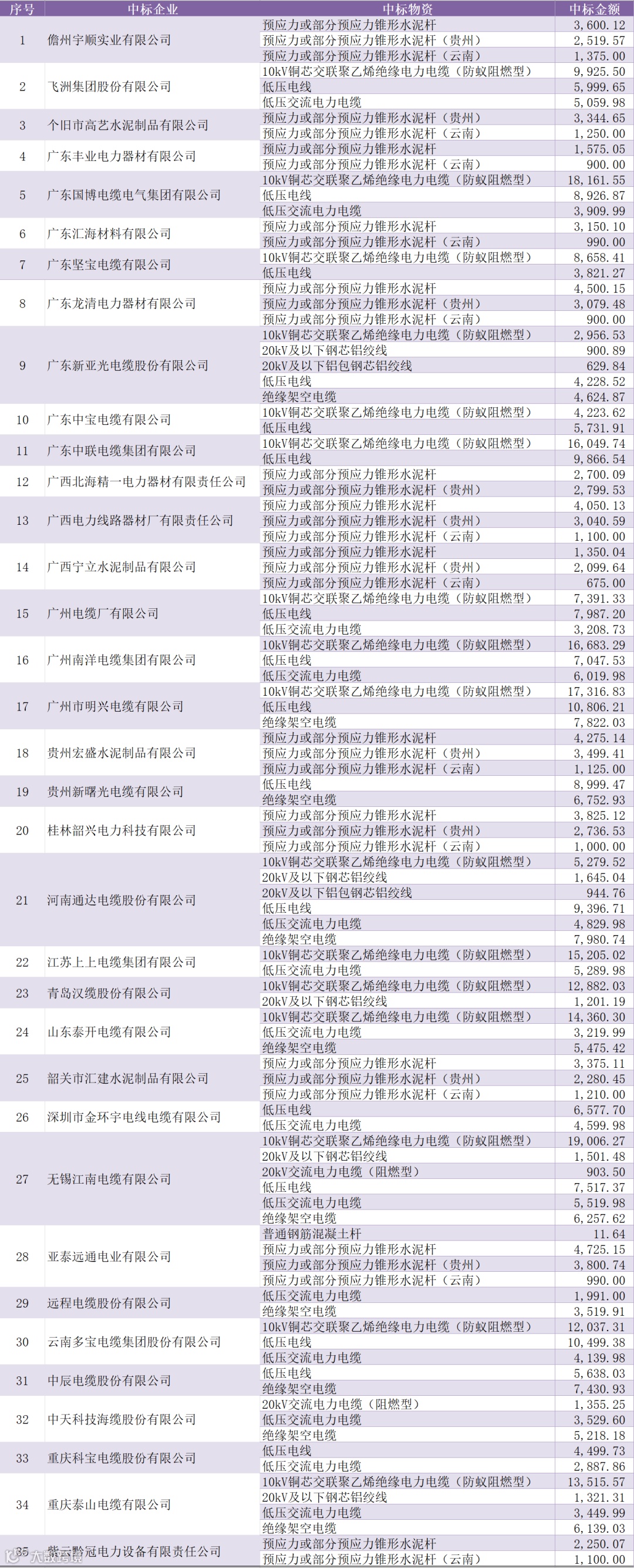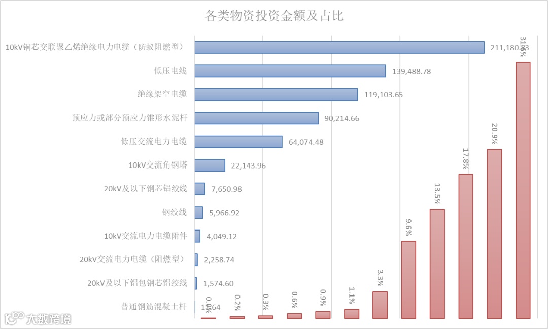 根据最终中标结果,10kV铜芯交联聚乙烯绝缘电力电缆(防蚁阻燃型)、低压电线、绝缘架空电缆、预应力或部分预应力锥形水泥杆、低压交流电力电缆、10kV交流角钢塔等6类物资标段在本项目的投资金额超过1亿元,这6类物资投资金额占本次项目投资总金额的96.8%。