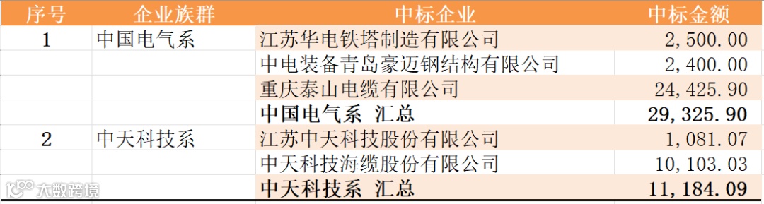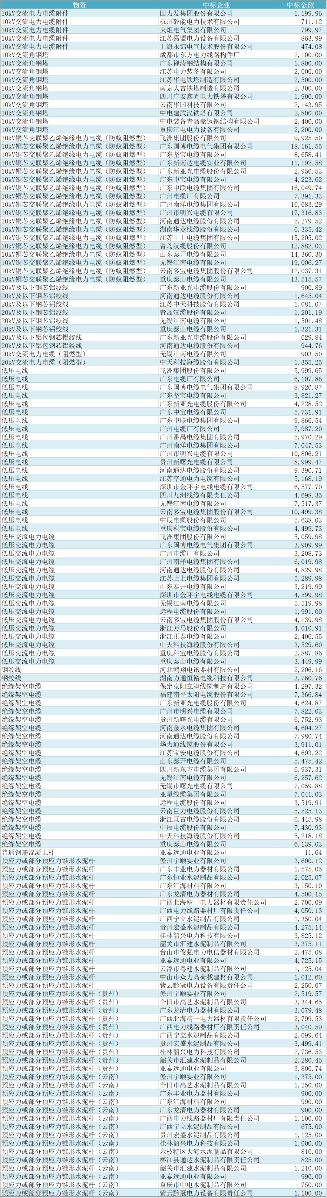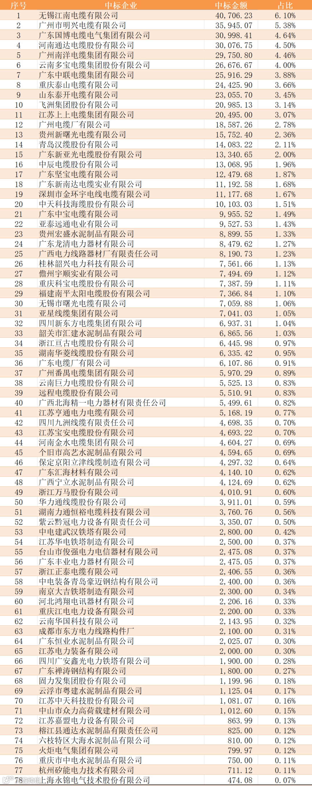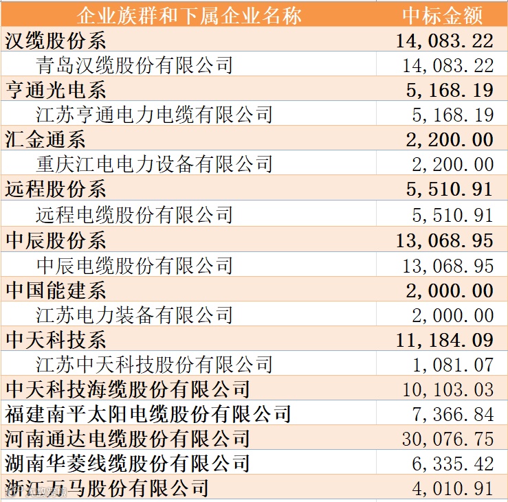 其中,上市企业部分,河南通达电缆股份有限公司中标金额30,076.75万元,青岛汉缆股份有限公司体系内企业合计中标金额14,083.22万元,中辰电缆股份有限公司体系内企业合计中标金额13,068.95万元。