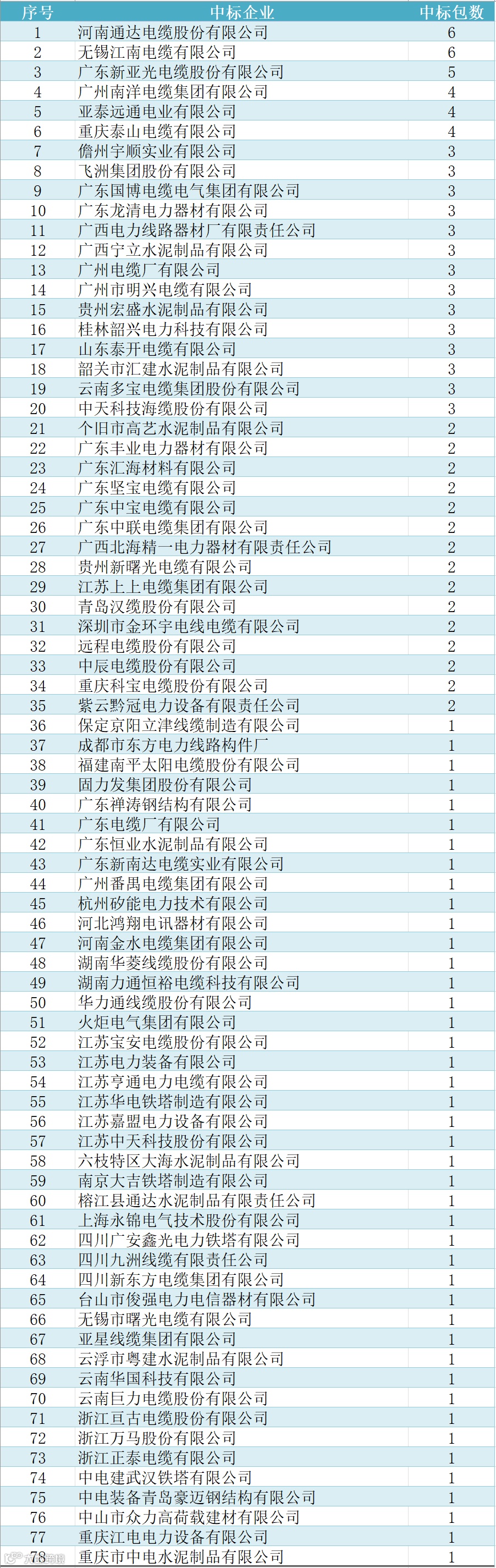 单一企业中标包数最多的是河南通达电缆股份有限公司和无锡江南电缆有限公司,在本项目中共计中标6个包;另有1家企业中标5个包以上,分别是: