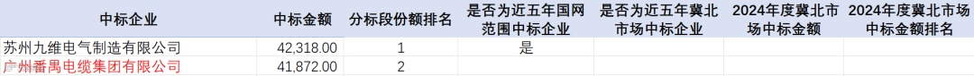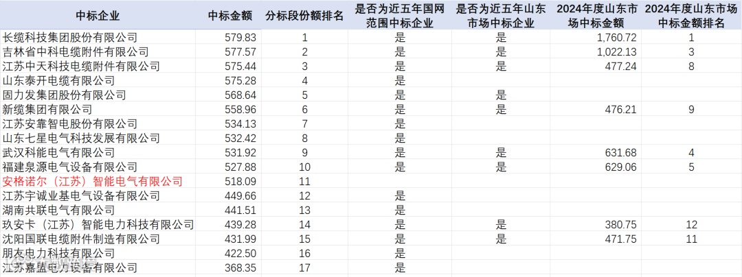 分析市场能力变化,2024年度中标企业中1家企业本次项目中标金额排名高于或与2024年度接近;0家近五年未在国网范围中过标的企业实现中标。详情如下: