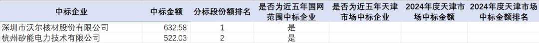 本项目2家中标企业有2家为近五年国网范围相同物资中标企业,同时0家为近五年天津市场中标企业,2家企业2024年度没有在天津市场相同物资中标。