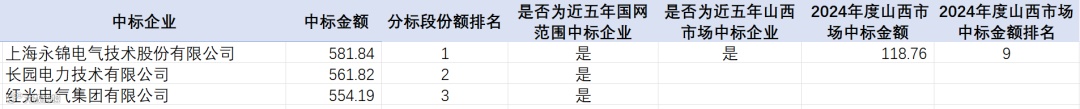 本项目3家中标企业全部为近五年国网范围相同物资中标企业,同时1家为近五年山西市场相同物资中标企业,有2家企业2024年度没有在山西市场相同物资中标。
