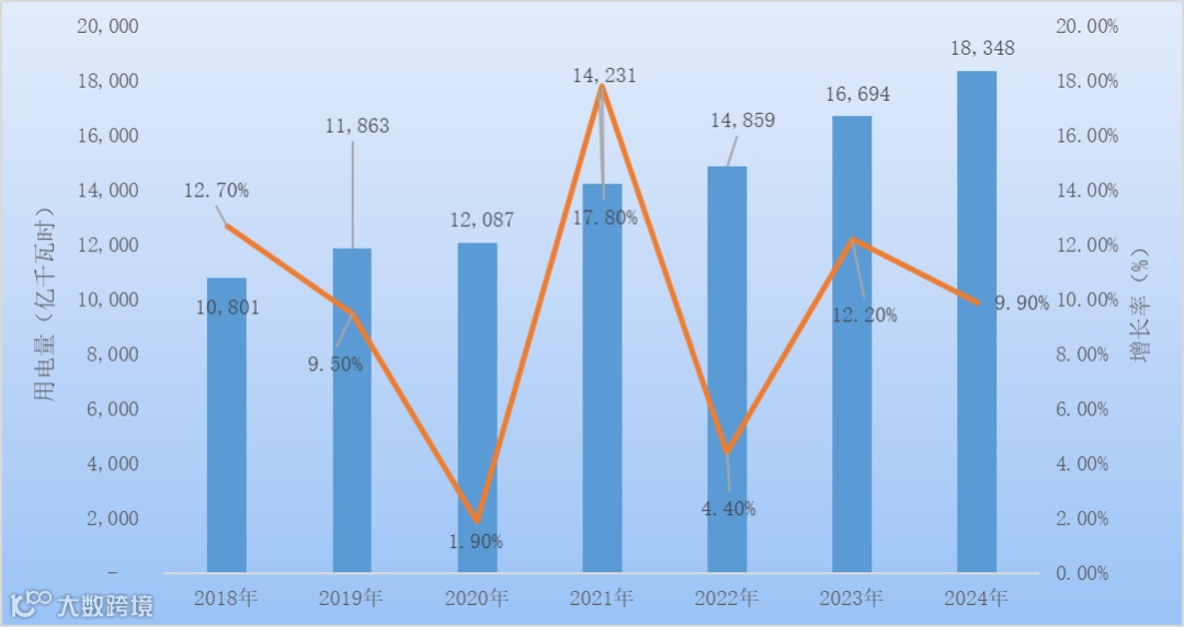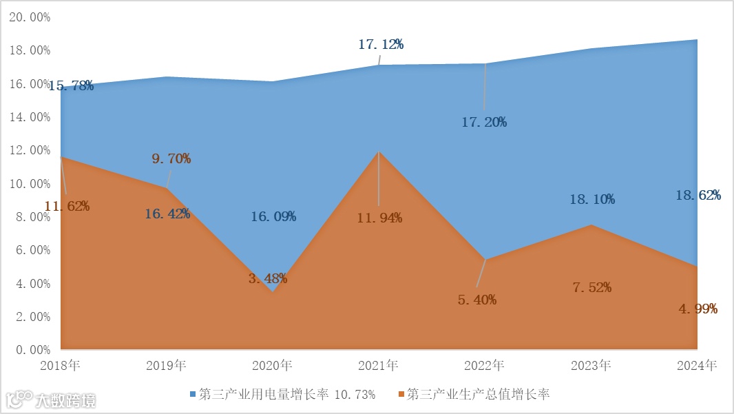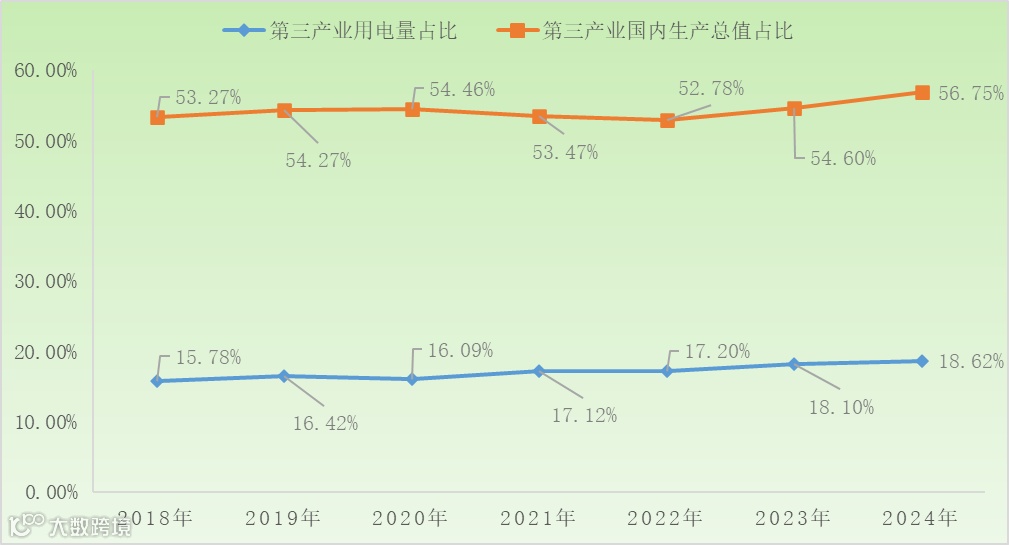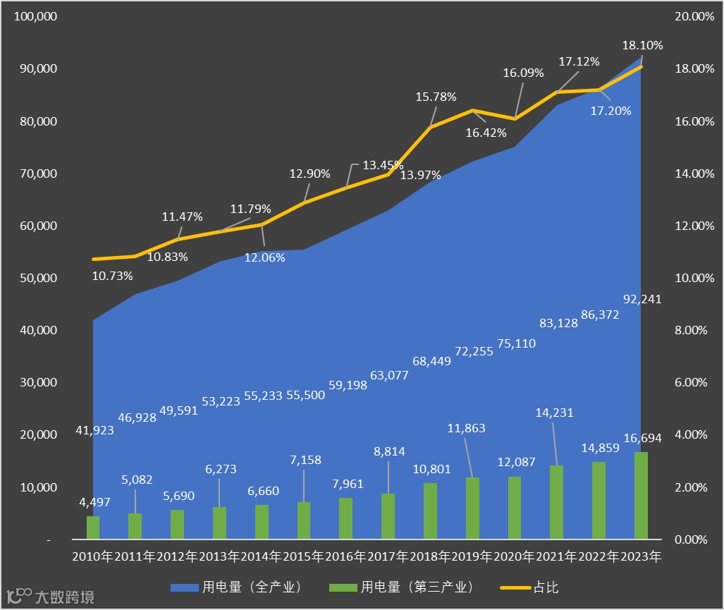 根据调整后的三次产业划分规定,自2018年以来至2024年底,中国第三产业用电总量增长了69.87%,从2018年的10,801亿千瓦时增长到2023年的18,348亿千瓦时,年复合增长率约9.23%。