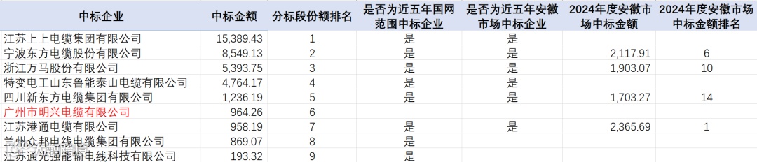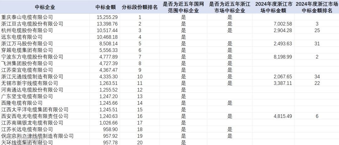 分析市场能力变化,2024年度中标企业中5家企业本次项目中标金额排名高于或与2024年度接近;0家近五年未在国网范围中过标的企业实现中标。详情如下: