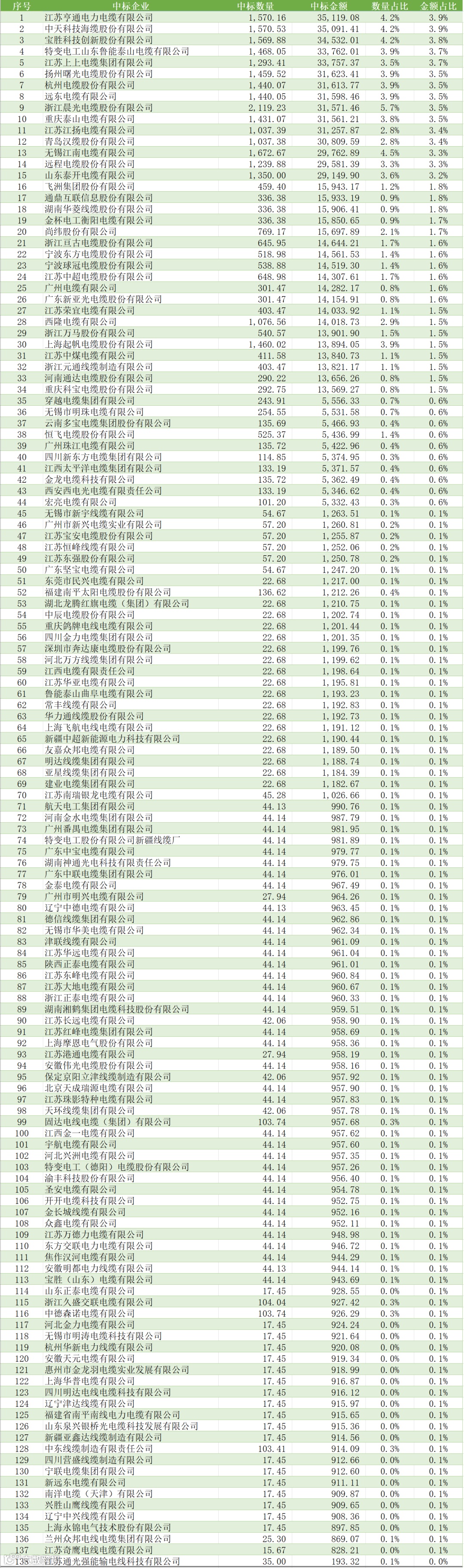 本次项目中标的138家企业,在2024年度总中标金额排名最低的为269名,其中43家企业在2024年度总中标金额排名在前50名以内。