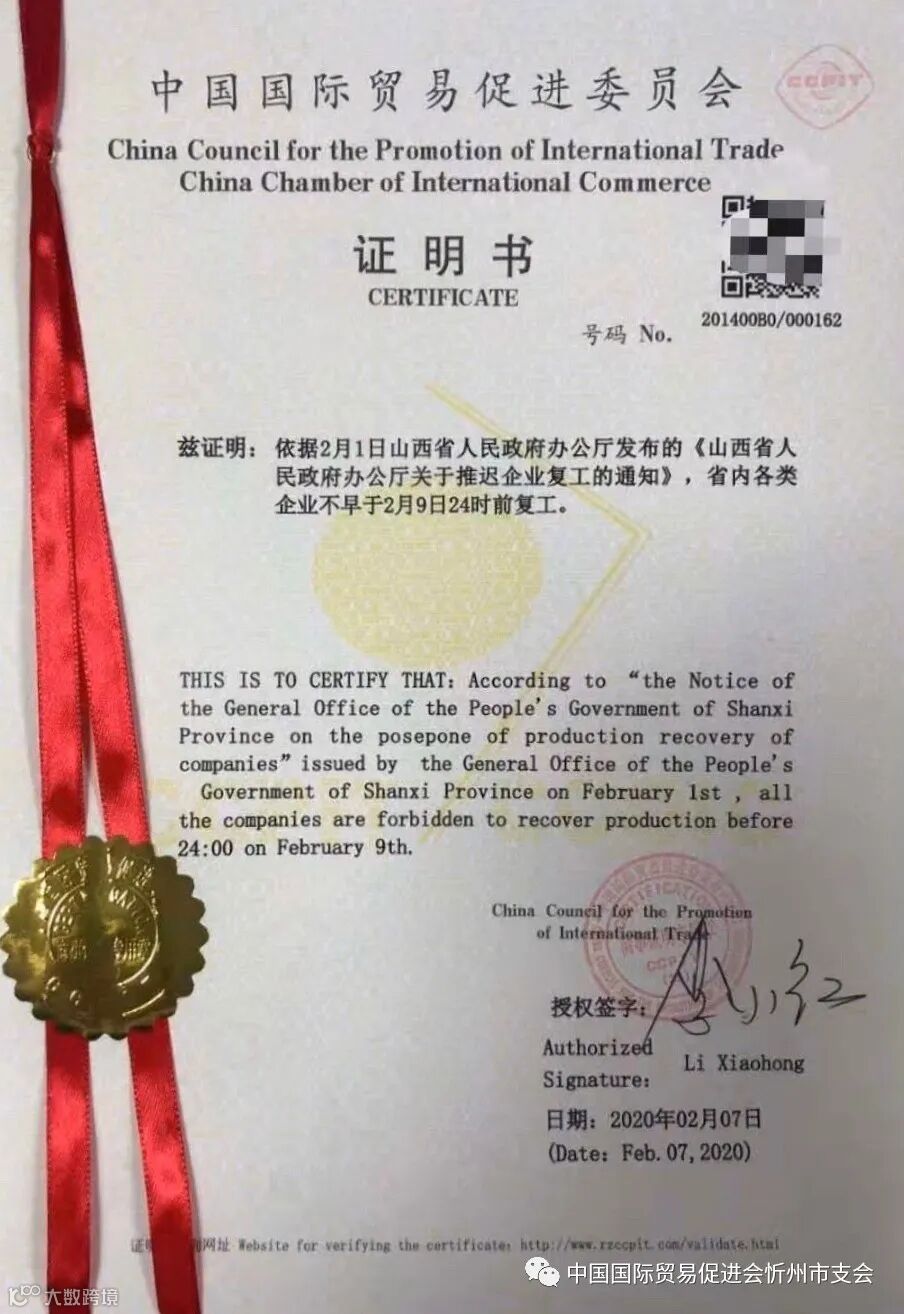 近日,忻州市贸促会围绕企业疫情期间不可抗力的订单执行情况进行深入调研、指导设立在我市区域内的山西管家营法兰集团有限公司太原办事处办理了《国际商事证明书》。