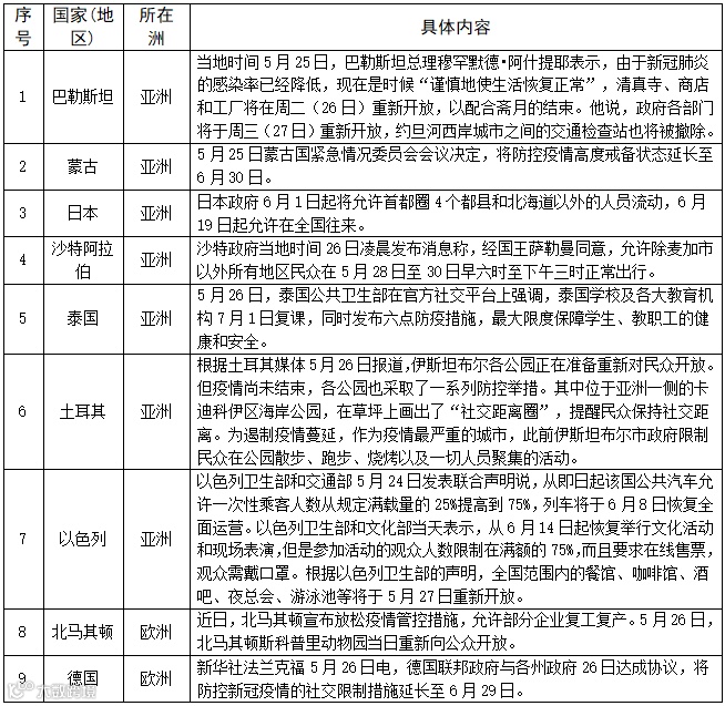 宣布进入紧急状态等情况的国家(地区)——截至5月27日,共有149个国家(地区)采取了相关措施。本期更新19个国家(地区),其中巴勒斯坦、日本、沙特、泰国、土耳其、以色列、北马其顿、俄罗斯、捷克、卢森堡、瑞士、匈牙利、英国、巴拿马、新西兰15个国家放松部分管制措施,启动不同程度的复工复产复课。具体情况如下: