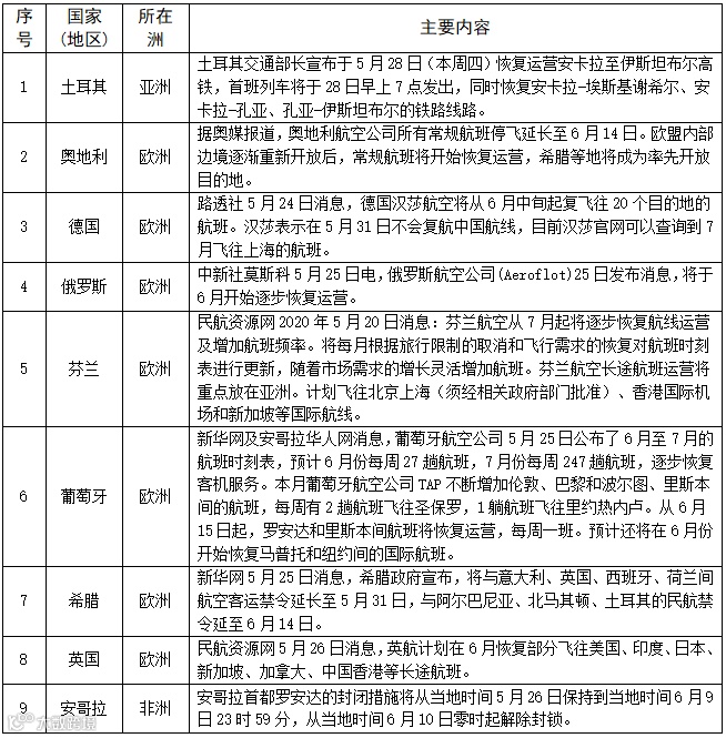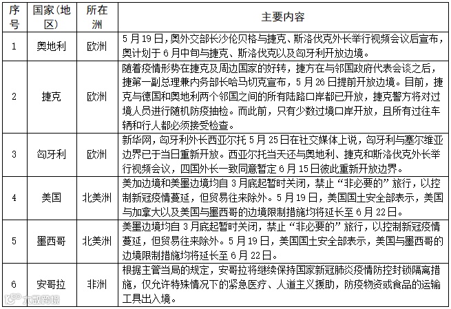 对边境口岸采取措施的情况——截至5月27日,共有101个国家(地区)采取了相关措施。本期更新6个国家,奥地利、捷克、匈牙利逐步开放与邻国的边境口岸。具体如下: