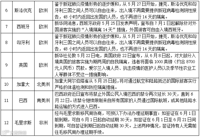 对人员入境采取措施的情况——截至5月27日,共有178个国家(地区)采取了相关措施。本期更新12个国家(地区),其中越南实行电子签证,并接受80个国家的电子签证持有者入境;丹麦、捷克、斯洛伐克、匈牙利允许部分外国人入境;西班牙取消入境隔离措施;毛里求斯签证到期可自动延期。具体如下:
