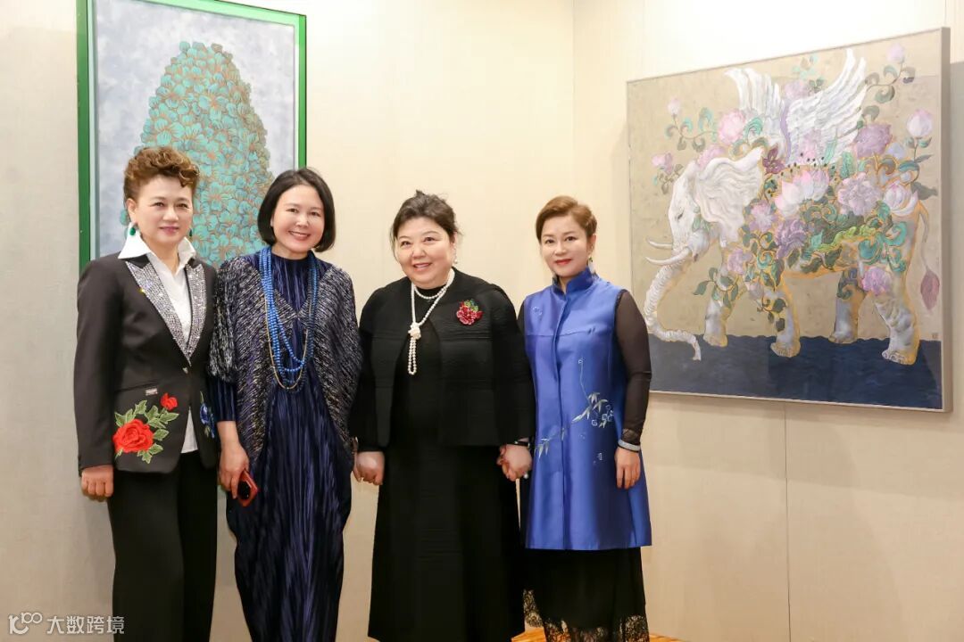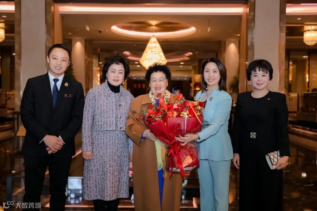 我会理事、北京朝林科技发展集团有限公司董事赵巍巍女士(右二)为莅临酒店的陈丽华会长送上鲜花