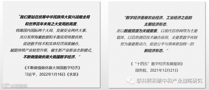 2022年年初,习主席发表的文章中指出,“我们要站在统筹中华民族伟大复兴战略全局和世界百年未有之大变局的高度,统筹国内国际两个大局、发展安全两件大事,充分发挥海量数据和丰富应用场景优势,促进数字技术和实体经济深度融合,赋能传统产业转型升级,催生新产业新业态新模式,不断做强做优做大我国数字经济。”这进一步说明了我国发展数字经济的重要性。