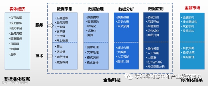 在实体产业跟金融市场对接的这个应用场景,目前企业采集的信息对于金融机构来说都是非标准化的,数量过少或是过多,都无法完整体现企业的金融价值。把非标准化的数据变成实时的、完整的标准化数据,也是一个从数据的采集,治理,分析到应用的过程。利用卫星遥感,隐私计算等服务和技术进行数据采集,采用数据提取和清洗,处理文字和图片进行数据治理,利用数据建模,大数据和人工智能完成数据分析,最后金融机构对接实体企业,提供估值,定价,交易和评估等服务,企业有资金发展企业,才有动力来改善信息化基础设施,提高信息化水平。此时,数据对金融机构和实体企业来说才是有价值的。涉及到之前讲的数字化服务产业链的每个环节,总结的来说包括数据的采集、数据的治理、数据的分析建模,到最后数据的应用。同时数字化服务产业链也是金融科技的基础。