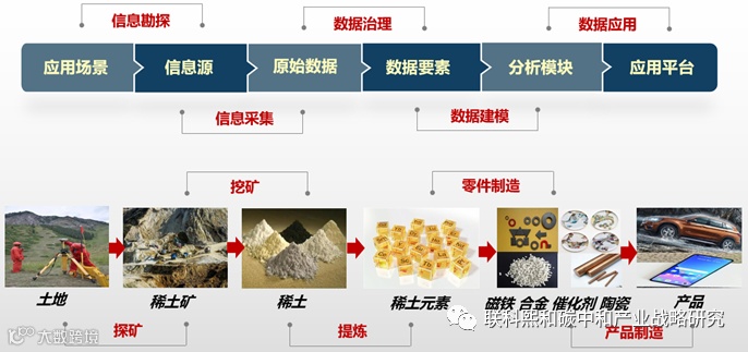 先分析数据如何成为生产要素。现在全国各地陆续成立了数据要素交易平台,还有数据的确权、数据的隐私保护、数据的安全都得到了重视。虽然数据交易是数据成为生产要素的重要环节,但光有数据交易是不够的,更需要建立一条完整的数字化服务产业链。参照稀土资源的产业链,如图4的下部分,从探矿,挖矿,提炼,到零部件制造,最终形成利用这个稀土的产品,如果只是买卖稀土元素或者买卖稀土是不够的,起码不是最有价值的。