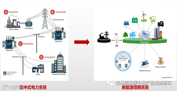 第一个例子——分布式能源(图9)。能源体系从现在的集中式的电力系统,正在朝着新能源、微电网体系转型。分布式光伏、风能、加上储能,原则上可以形成脱离大电网的微电网体系。这就是从集中式,因为创新朝分布式方向走的一个例子。
